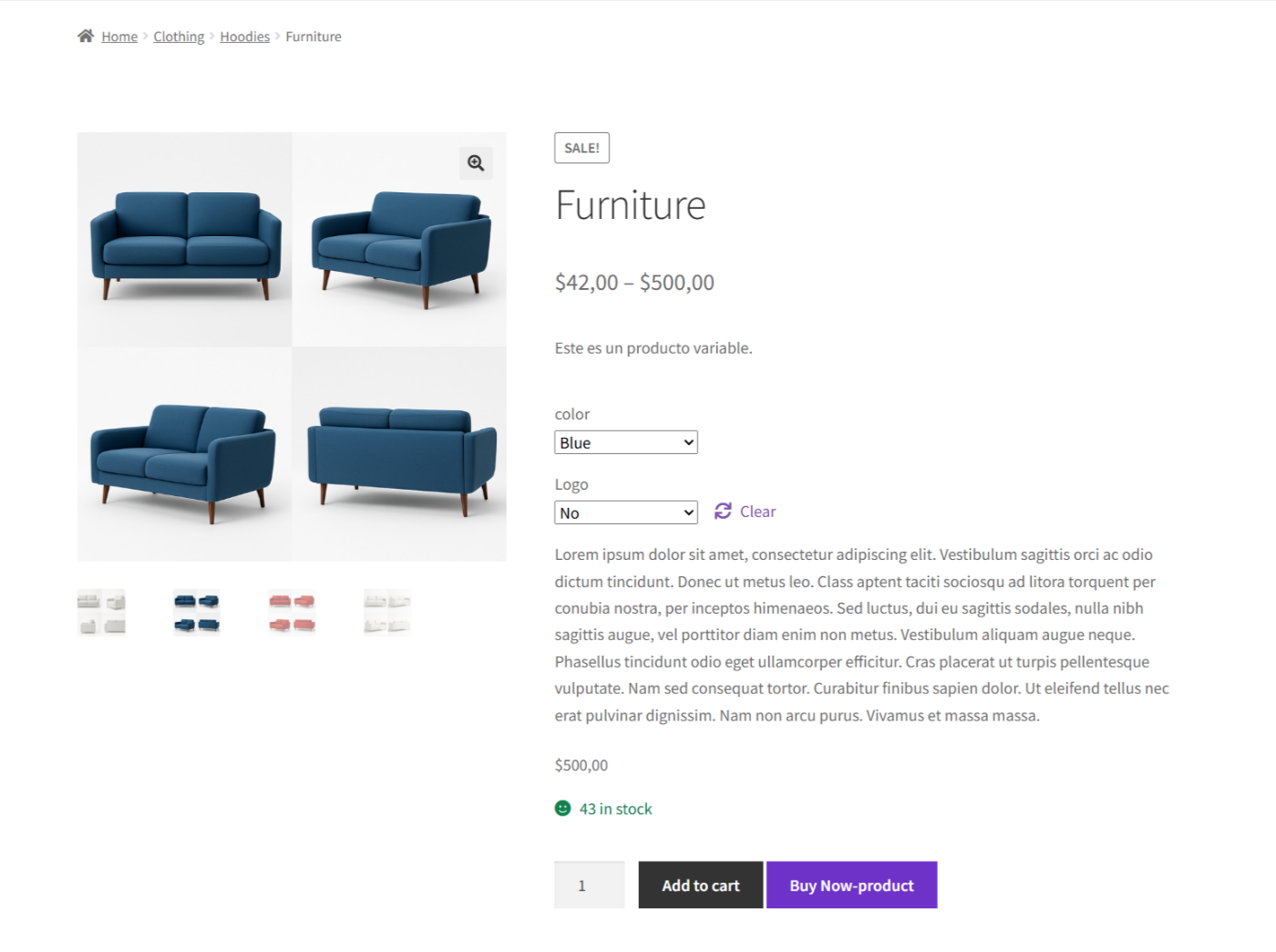 The Buy Now button appears only after the customer selects a valid combination of variations (e.g., Color + Logo).