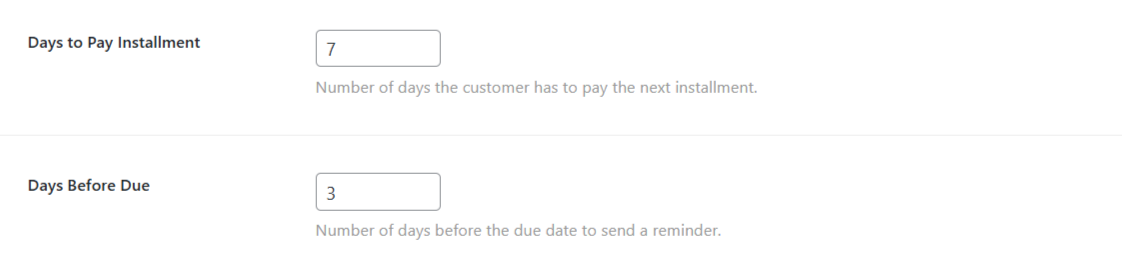 - Days to pay installment — number of days customers have to pay the remaining balance.
