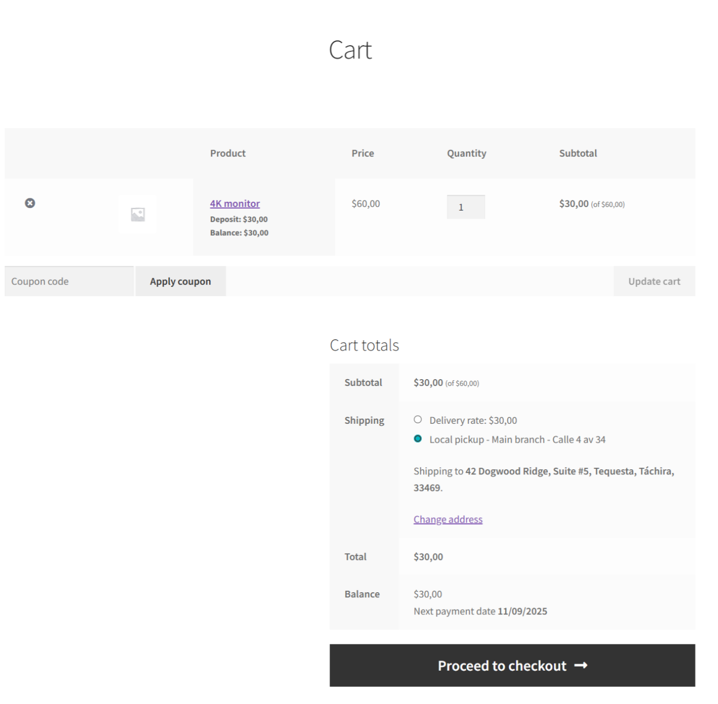 The customer pays the deposit amount at checkout. The order status updates accordingly.