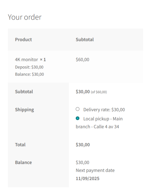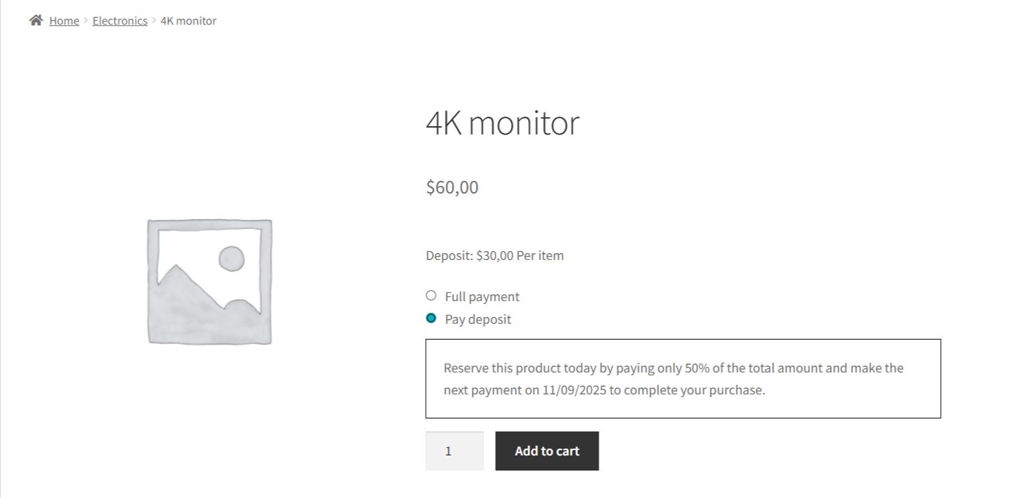 On the product page, customers can choose to pay the deposit or, if enabled, the full payment.
