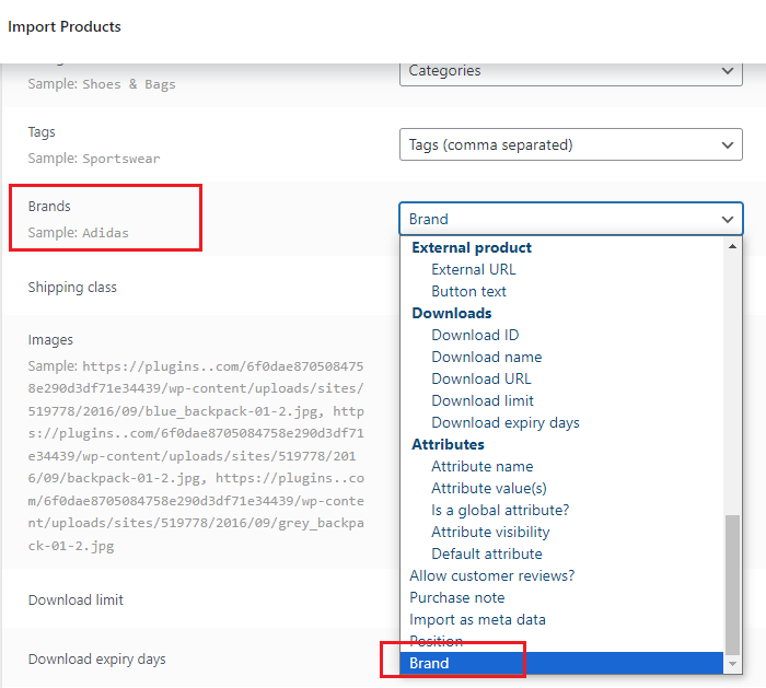 The compatibility with woocommerce export/import allows mapping the Brand taxonomy when import/export products