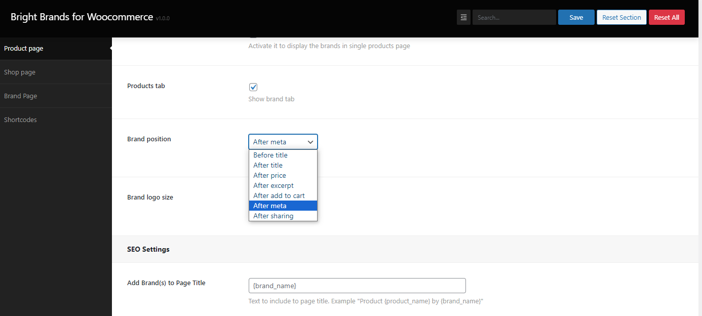 Brand Position: Choose the position inside the product summary to insert the brand logo