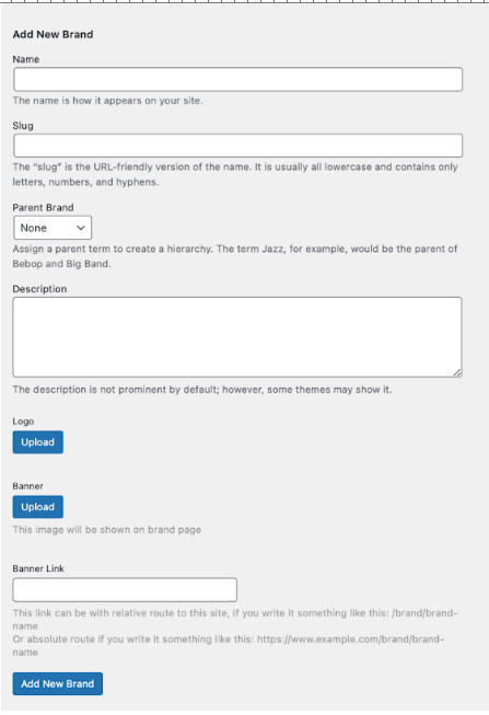 - You can add the logo, banner, description, banner link, slug, and name of the brands you are adding