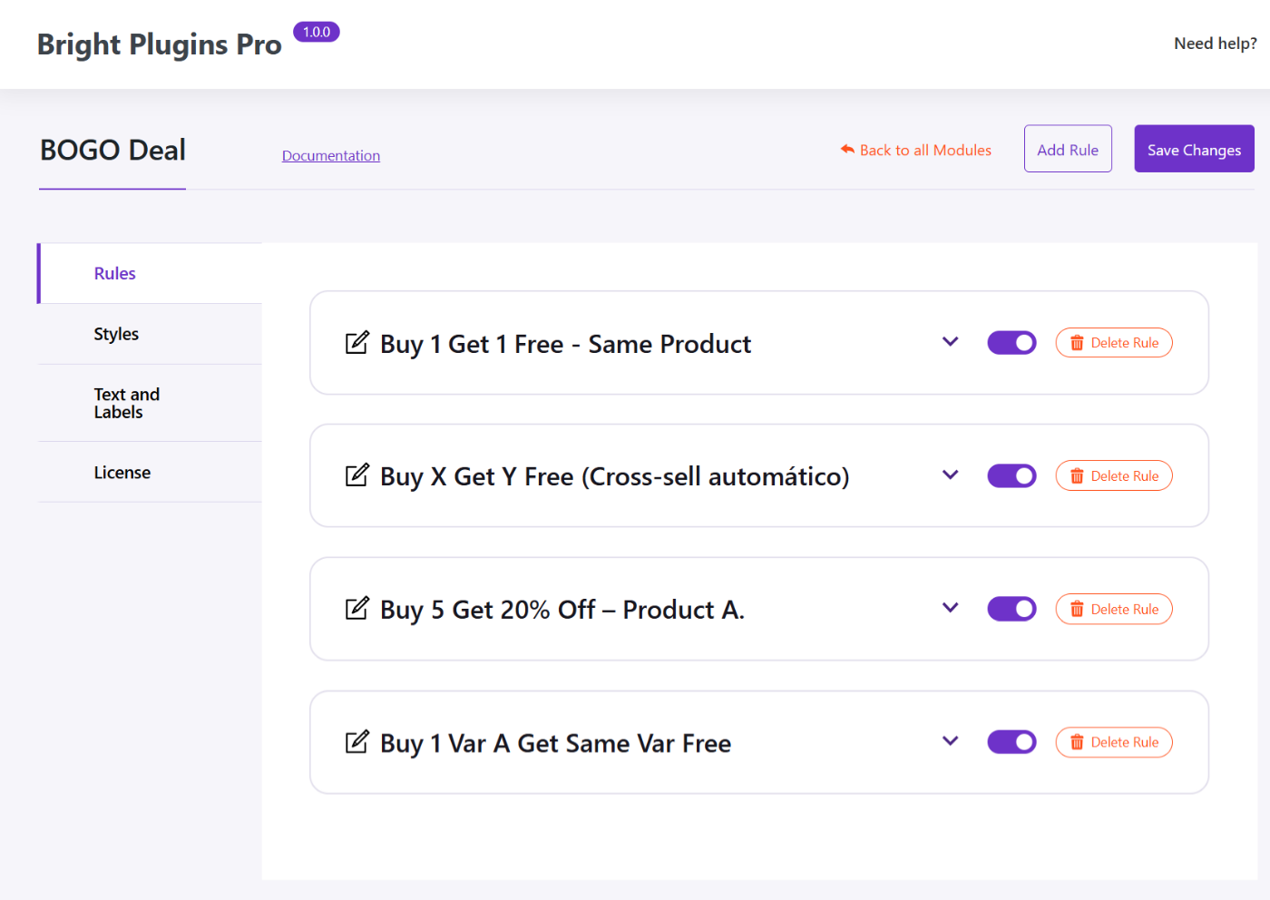 Create powerful Buy one, Get one promotions with flexible rules, custom styles, and fully editable texts all from a clean, modern interface inside your WooCommerce dashboard.